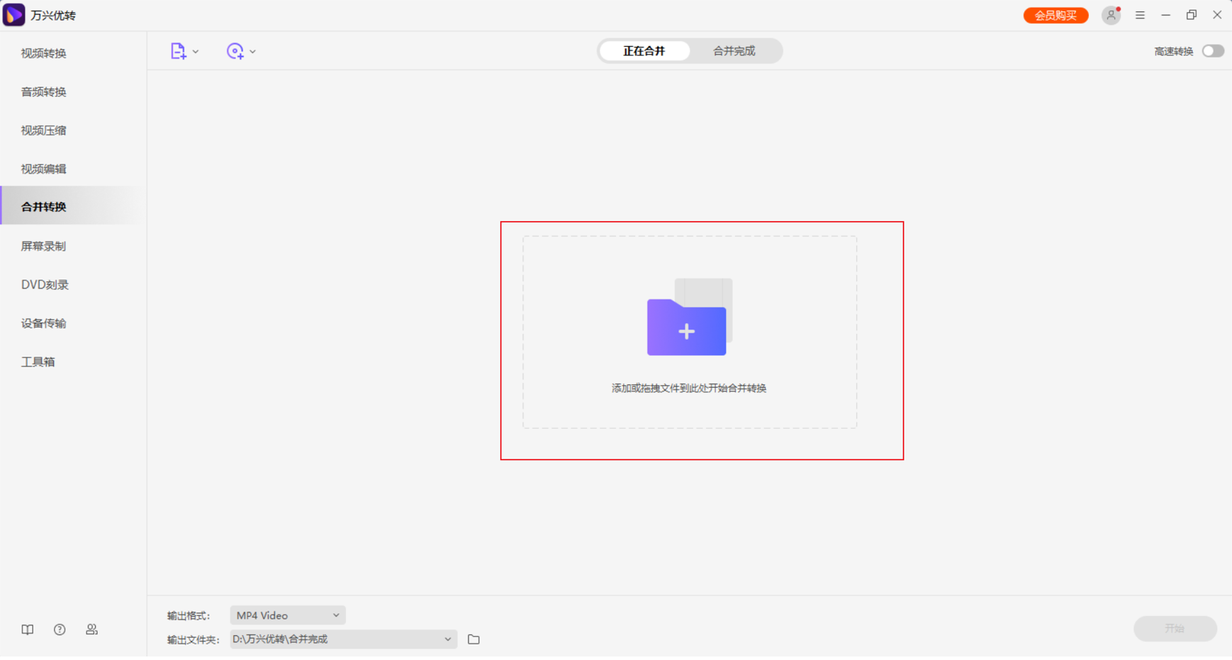 在日韩精品久久久久优转左侧找到合并转换的模块,选中中间的文件夹图标找到刚才已经剪切好的视频片段,或者直接将已经剪切好的视频片段拖拽到这个文件夹图标上。