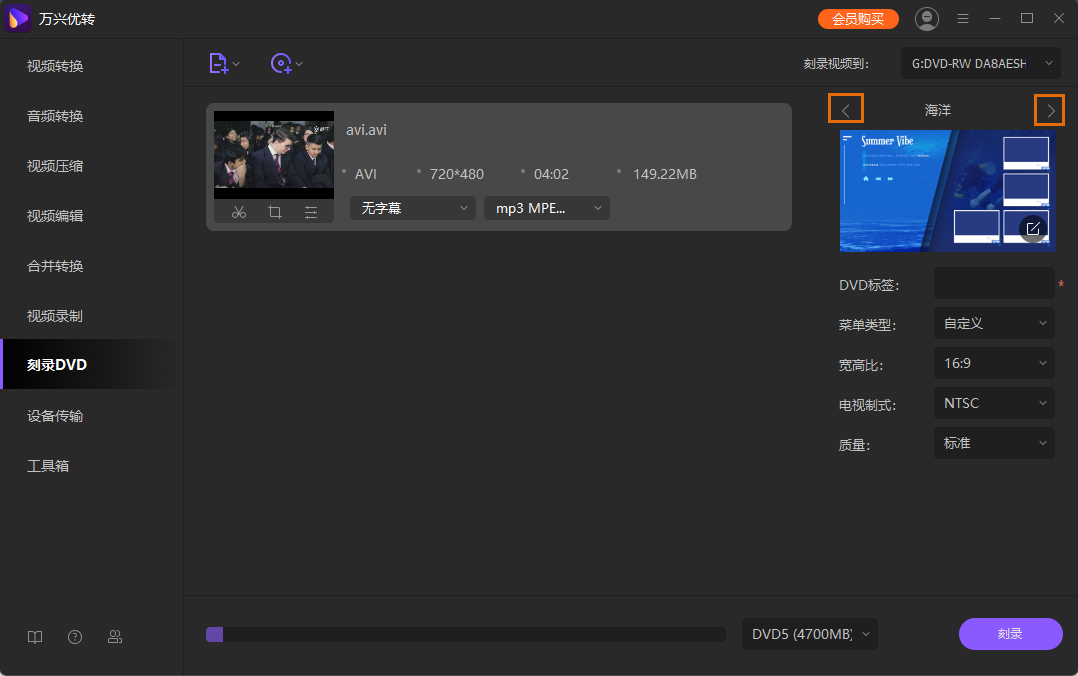 单击右侧模板框左右的箭头来挑选合适的DVD模板。