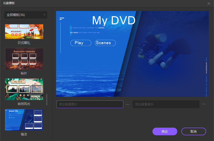 或者,单击任一模板以进入DVD模板窗口,从左侧窗格滚动模板列表,然后单击您感兴趣的一个。,单击“添加背景图片”和“添加背景音乐”旁边的“浏览”图标(带有三个水平点…)分别从本地硬盘驱动器中选择自定义背景图像和音频轨道。从右下角点击OK以保存首选项并返回到DVD刻录机窗口。