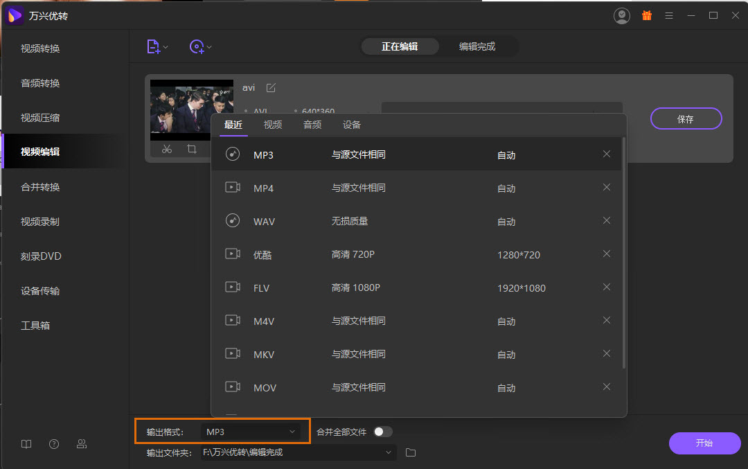 现在返回到程序主界面,点击输出格式旁边的下拉按钮选择刚刚裁剪的视频的输出格式,点击开始继续。