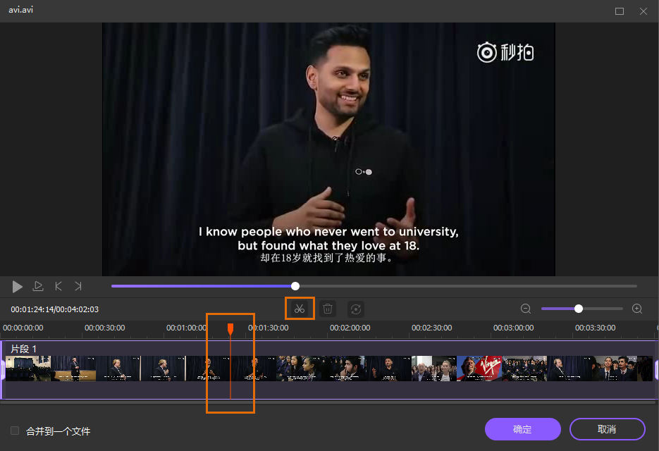 如果你想把一个长视频剪辑成几个小片段,你可以拖动时间滑块到你想要剪辑的地方,然后点击剪切按钮,重复这个步骤来剪切片段。视频将被分成几个片段。剪切完成后,点击保存按钮继续。